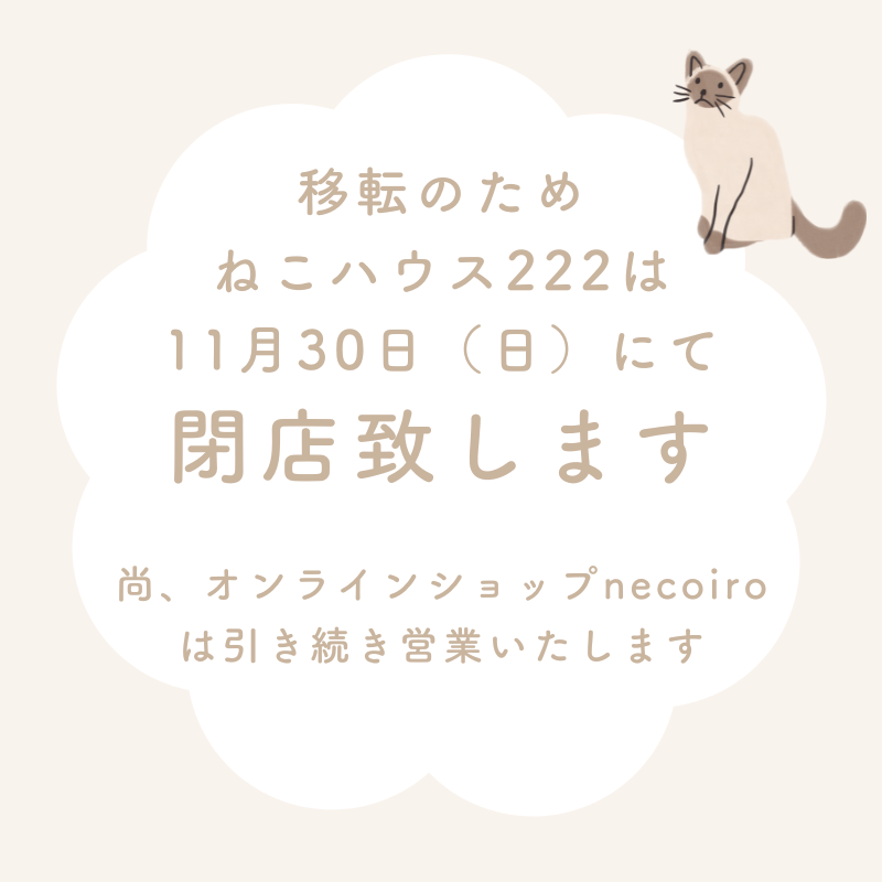 ねこハウス222の実店舗でございますが、移転のため11月30日(日)を持って閉店とさせて頂きます。開店以来、皆様よりご愛顧いただきありがとうございました!